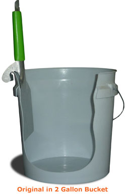 The Original BucketScoop is designed for use with gallon and larger sized containers. Patented Monkey-Thumbs™ allows scoop to hang from edge of bucket to keep the handle out of the mess!